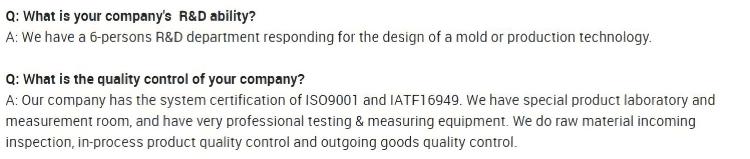 SGS, ROHS, IATF16949:2016 lub kontrola strony trzeciej dostępna na życzenie klienta. |